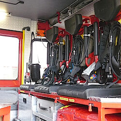 Für Brandeinsätze ist das Fahrzeug mit fünf Pressluftatmern ausgestattet. Im Mannschaftsraum können bereits während der Anfahrt zur Einsatzstelle drei umluftunabhängige Atemschutzgeräte aufgenommen werden.