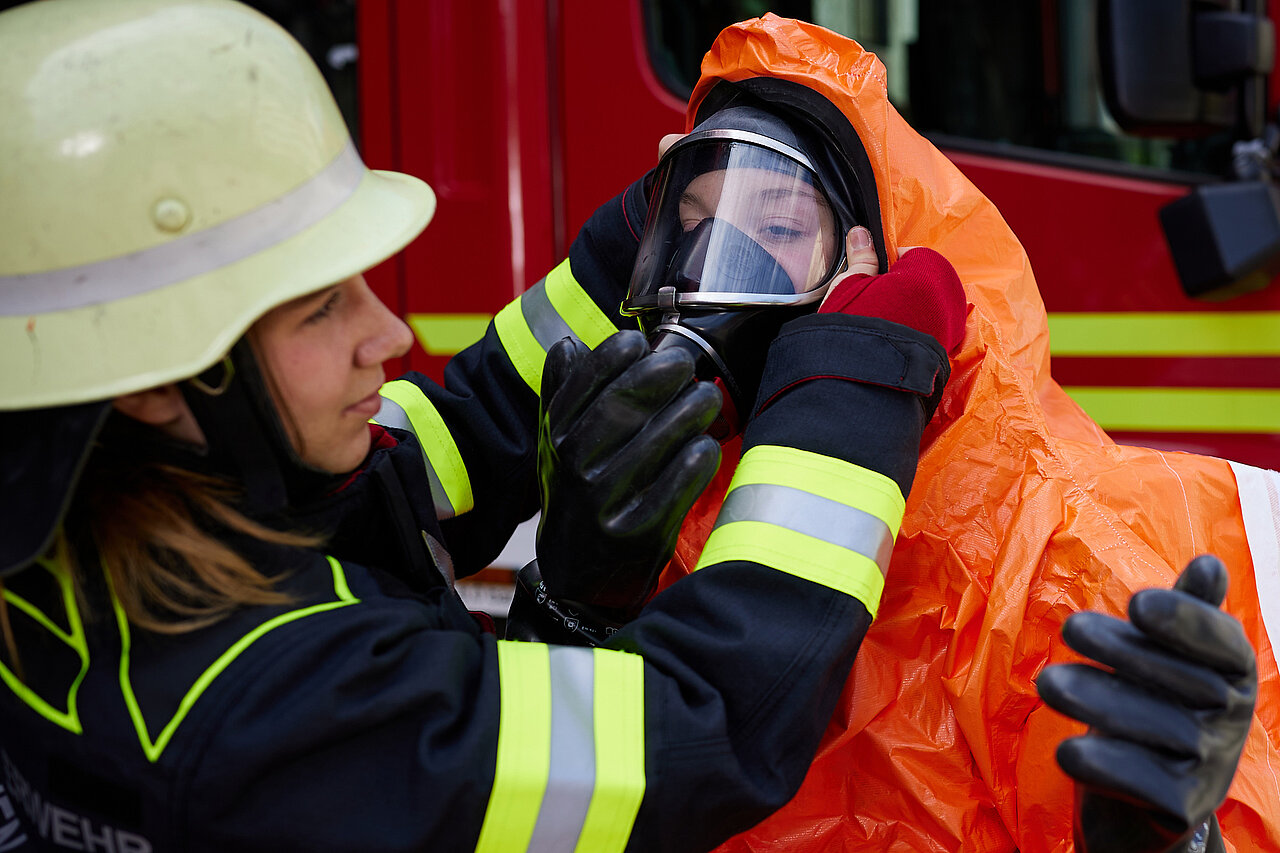 Der Spritzschutzanzug besteht aus einem mehrschichtigen chemikalienbeständigem Material, das weder wasserdampf- noch luftdurchlässig ist. Als zusätzlicher Schutz zu den getragenen Feuerwehrgummistiefeln ist der Schutzanzug mit integrierten Stiefelsocken und ableitfähigem Tropfrand ausgestattet.